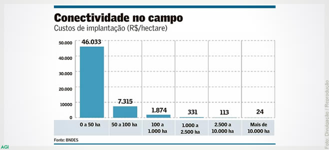 Dono de 99% dos estabelecimentos rurais (99% do total) e responsável por 52,4% da área plantada, o grupo de produtores com até mil hectares no Brasil terá que pagar mais se quiser levar infraestrutura para ter conectividade em suas propriedades. Para aqueles com até 50 hectares, o valor é de cerca de R$ 46 mil por hectare, segundo o BNDES.