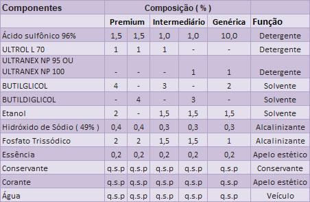 A combinação dos tensoativos Ácido Sulfônico 96% e ULTRANEX NP 95, ULTRANEX NP 100 ou ULTROL L 70, com os solventes BUTILGLICOL ou BUTILDIGLICOL proporciona maior poder de remoção de sujeira para limpeza de pisos, pias, azulejos, fogões, entre outras. Adicionalmente, as formulações são biodegradáveis