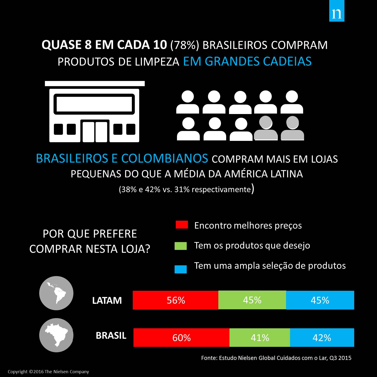 ONDEM FAZEM AS COMPRAS E QUAIS SÃO OS MOTIVADORES – Varejistas modernos estão liderando em todas as regiões sendo o lugar favorito para comprar produtos de limpeza. Quase 8 em cada 10 (78%) brasileiros compram esses itens em grandes cadeias (vs. 81% da região), como supermercados ou hipermercados. Eles preferem fazer as compras nessas lojas maiores por encontrar os melhores preços (60%), os produtos que desejam (41%) e pelo sortimento deles (42%). A distribuição é o principal condutor da prova de testes de produtos e está correlacionada positivamente com o volume de produtos. Um ponto interessante a ressaltar no estudo é que, mesmo com uma porcentagem menos expressiva, os brasileiros compram mais em lojas pequenas do que a média da América Latina (38% vs. 31%).