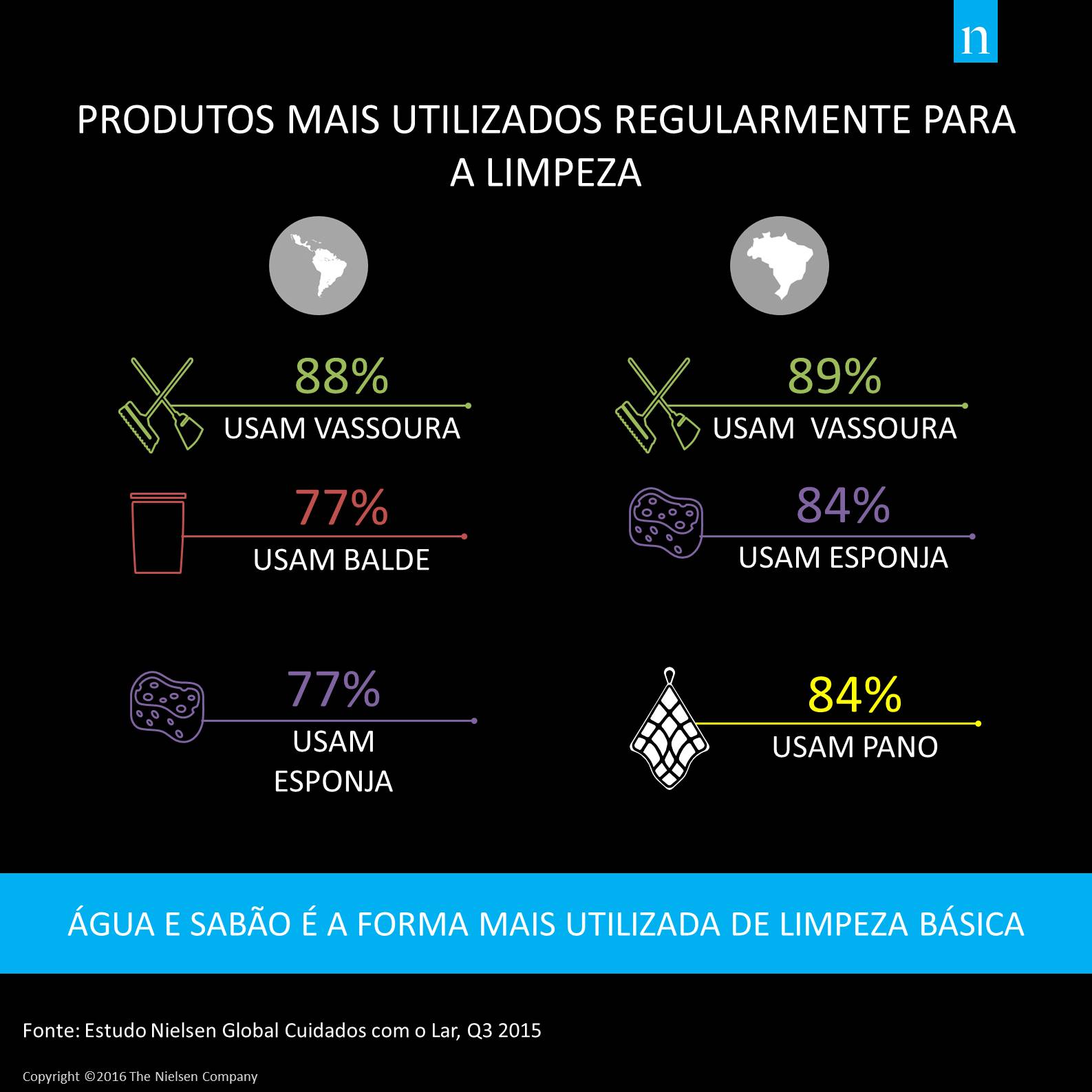 Tanto latinos quanto brasileiros se preocupam mais com a limpeza do banheiro (86% vs. 88% da região) e da cozinha (84% vs. 85%) que com os outros espaços da casa, como o quarto e a sala. Para a limpeza básica, os brasileiros gostam mais de utilizar álcool (63%) e água e sabão (66%), assim como os latinos (76%). Quanto às ferramentas mais usadas pelos consumidores no Brasil na hora da faxina são elas a vassoura, a esponja e o pano.
