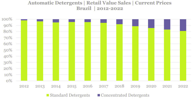 Uma tendência vista é a busca por produtos de alto valor agregado em determinadas categorias no segmento de limpeza, principalmente naquelas na qual inovação e diferenciação entre as marcas são mais facilmente visíveis. Esse movimento impulsionou a categoria dos detergentes concentrados cujas vendas apresentaram um crescimento de 31% em 2017. Além do forte crescimento no último ano, a categoria ganhou mais relevância em relação às outras categorias de detergentes para roupas.