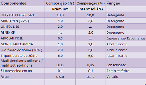 A combinação dos tensoativos ULTRADET LAB S e UNITOL L 80, ou RENEX 95, com o alcalinizante MONOETANOLAMINA proporcionam maior poder de remoção de sujeira na lavagem de latarias de automóveis. A incorporação de ALKOPON N e ALKOLAN PK 2L proporcionam alto poder espumante, suavidade para a pele e facilita a solubilidade em água e melhora a estabilidade da formulação. Além disso, as formulações são biodegradáveis.