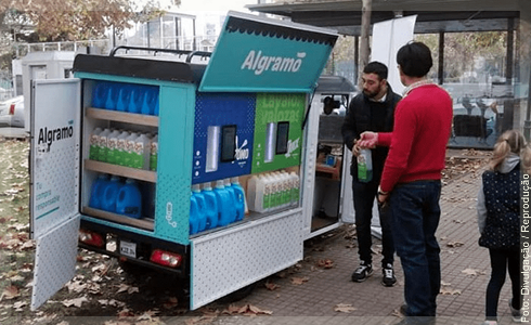 Quando o cliente enche a embalagem, seguindo o princípio da economia circular, ele recebe uma recompensa em pesos (moeda local chilena) que pode ser usada para pagar para uma nova recarga futura ou ainda ficar com opção de acumular para fazer outras compras.